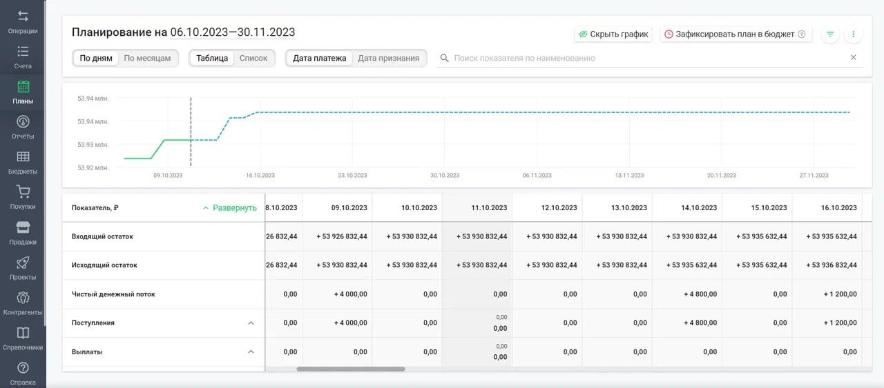 Также в разделах «Планы» и «Бюджеты» появилась кнопка «Зафиксировать план в бюджет», которая позволяет быстро записать в бюджет суммы плана на основе плановых операций, разнесённых по статьям. Можно вести бюджет по организации или по проекту, фиксировать по дням, неделям и месяцам.