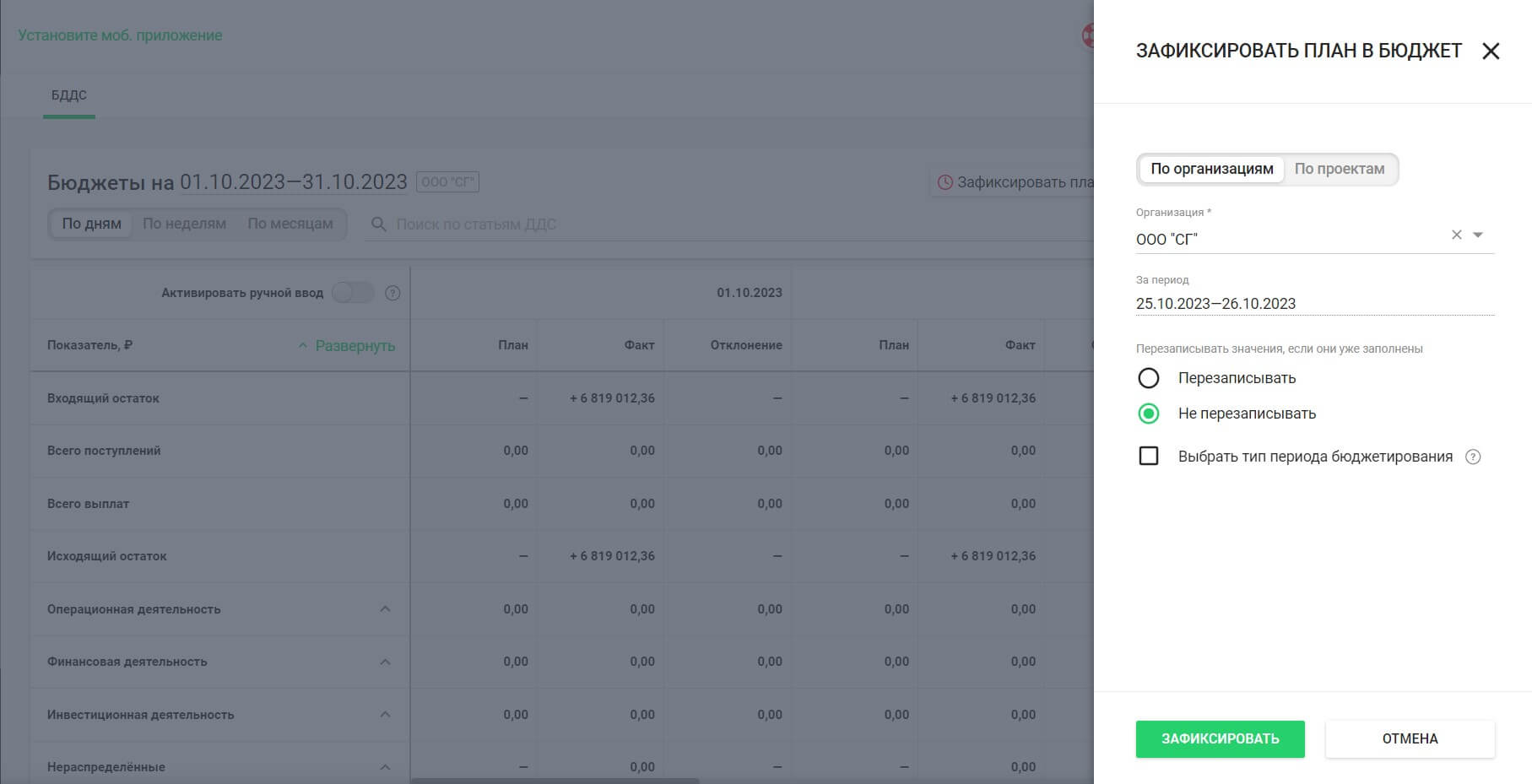 Выберите организацию или проект, укажите временной отрезок, можно скорректировать тип периода. После нажмите «Зафиксировать», и суммы плановых операций по статьям за указанный период запишутся в бюджет.
