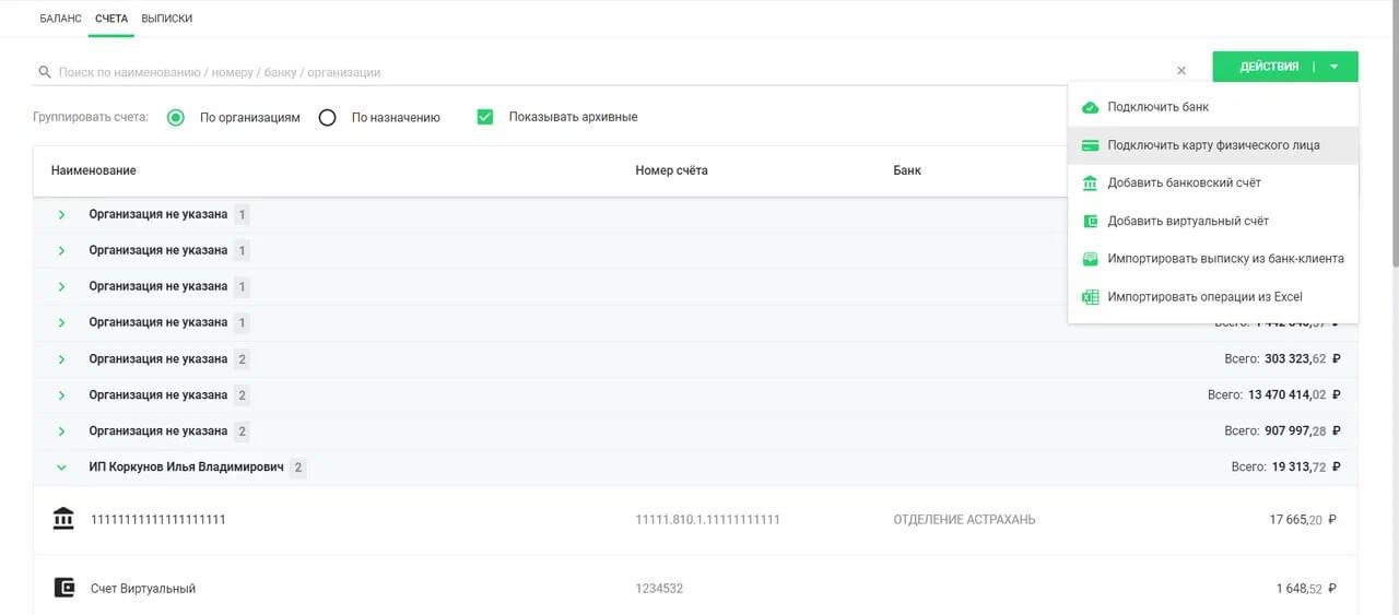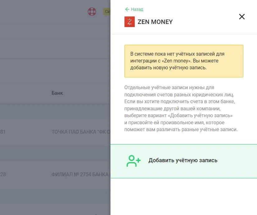В списке возможных действий в разделе «Счета» (вкладка «Счета») появился пункт «Подключить карту физического лица». В первый раз (для добавления интеграции) нужно нажать на эту кнопку, выбрать интеграцию «ZEN MONEY», нажать «Добавить учётную запись», ввести логин и пароль от Дзен-мани. Если в Дзен-мани вы регистрировались с помощью мобильного приложения и не задавали пароль, то задать пароль можно в веб-версии Дзен-мани на странице настроек. После подключения интеграции возможно добавлять счета из Дзен-мани так же, как и для других интеграций.